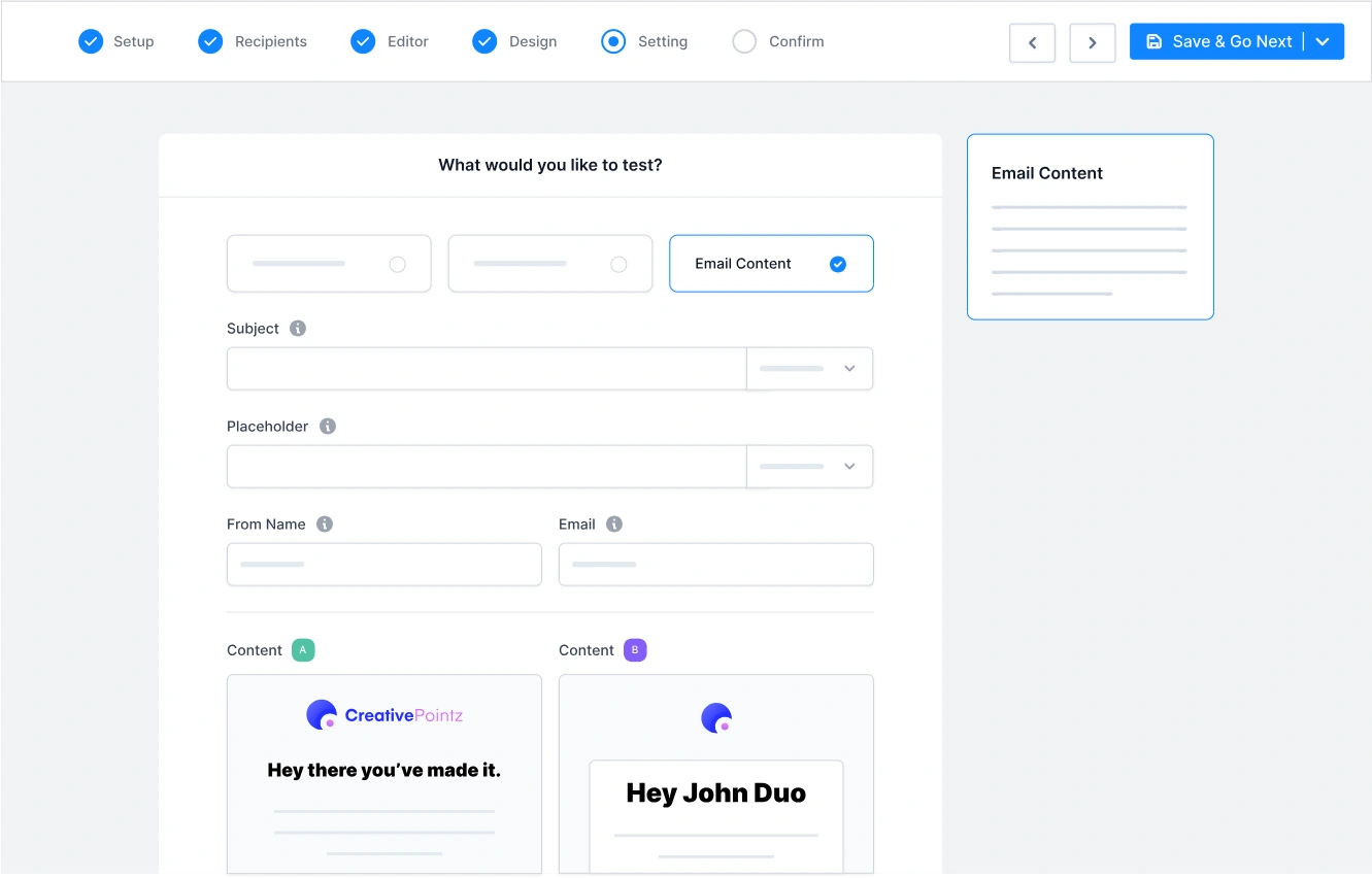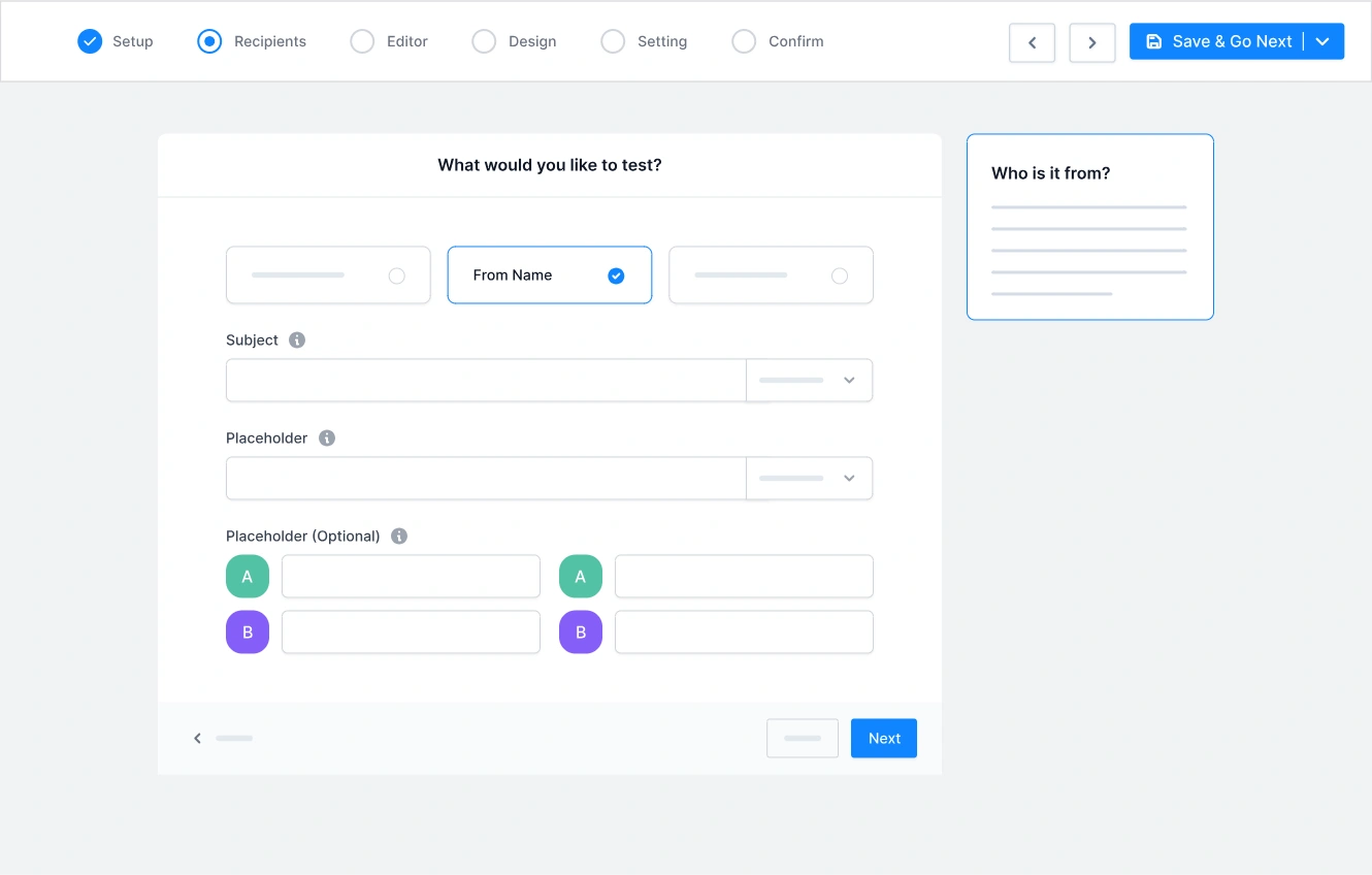 Create two variations of a single email, send them to two different groups, and measure the result. You can test sender info, subject line, or email content – one variable at a time.