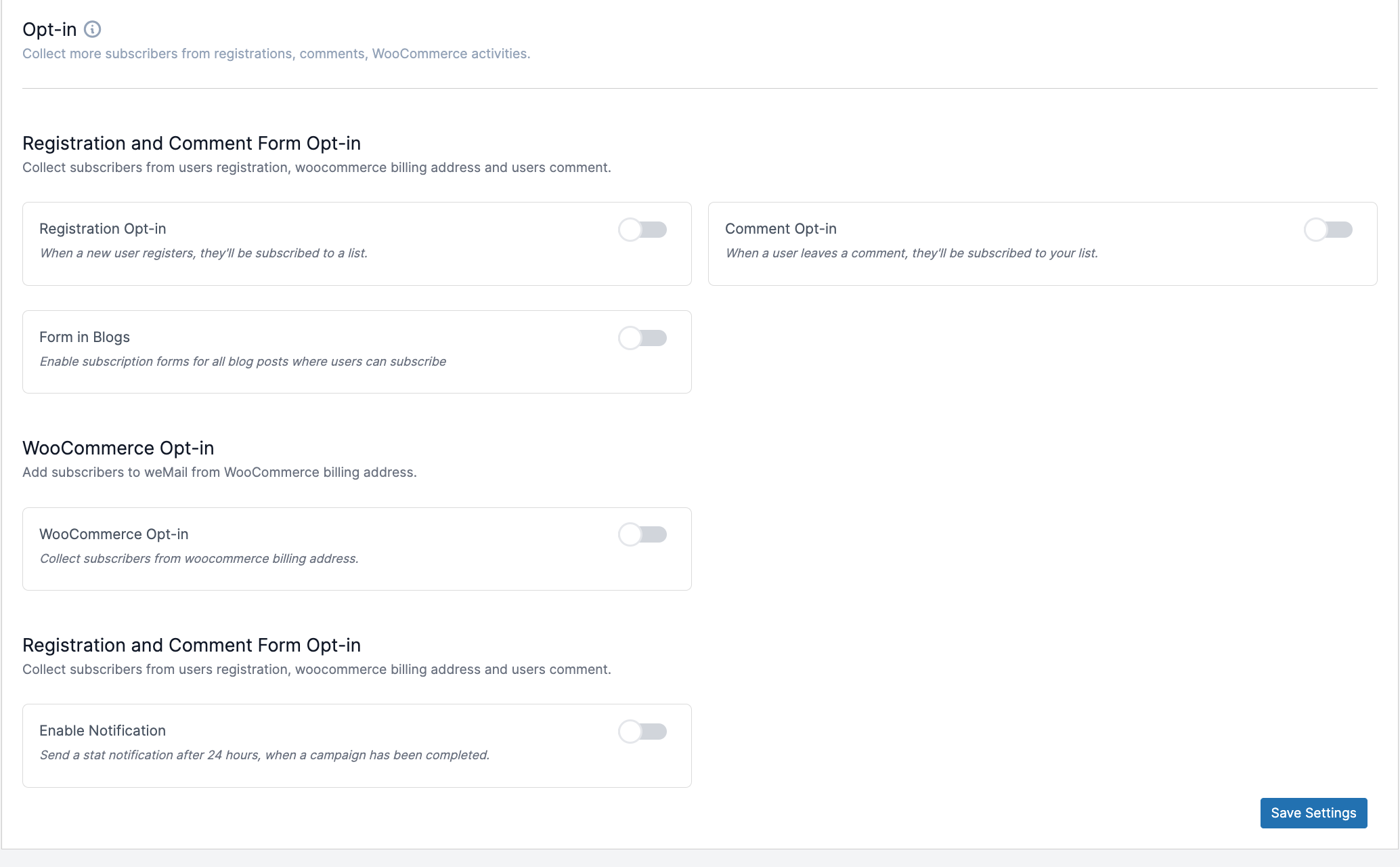 Under Opt-in Settings, you’ll find several options to help you grow your email list across your site.