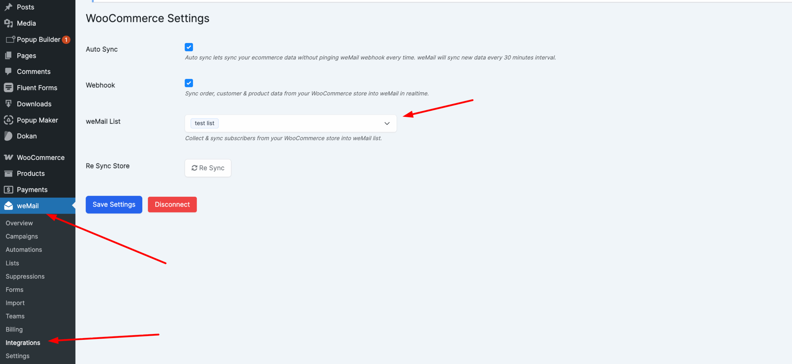 Inside weMail’s settings, toggle on the WooCommerce integration. This is where things get interesting. weMail instantly syncs your entire customer list, pulls in purchase history, and starts tracking order activity in real time. Your existing customers are already in the system the moment this is switched on.